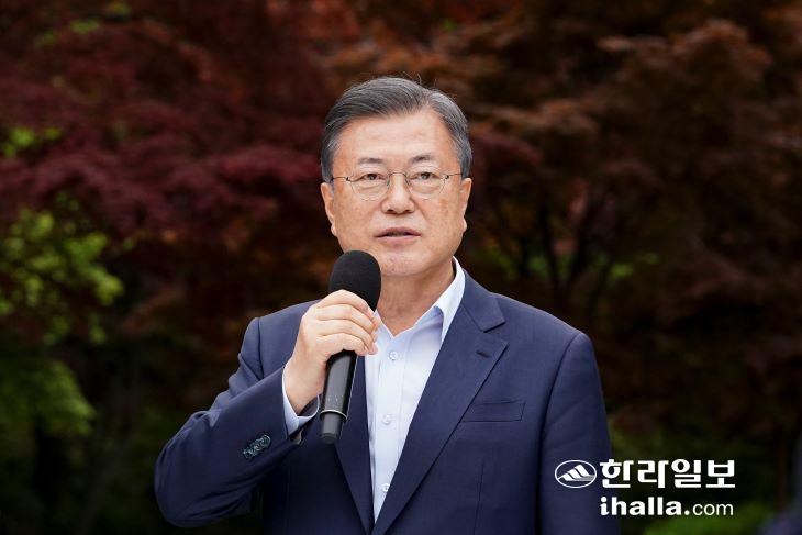문재인 대통령이 25일 오후 청와대 녹지원에서 열린 출입기자 간담회에서 인사말을 하고 있다. 연합뉴스