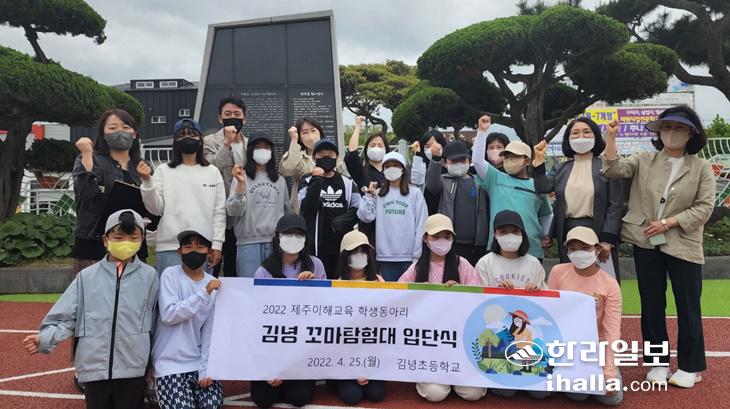지난 25일 '김녕 꼬마탐험대' 입단식에 참석한 김녕초 5학년 학생들이 교사들과 한산 기념비 앞에서 기념촬영을 하고 있다. 사진=김녕초