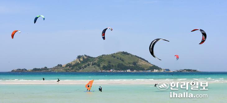 비가 그치고 화창한 날씨를 보인 27일 제주시 한림읍 금능해수욕장에서 카이트서퍼들이 서핑을 즐기고 있다. 이상국기자