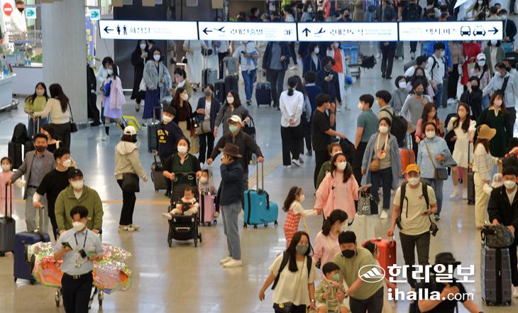 28일 오전 제주국제공항 국내선 도착 대합실에는 제주를 찾은 많은 관광객들로 붐비고 있다. 강희만기자