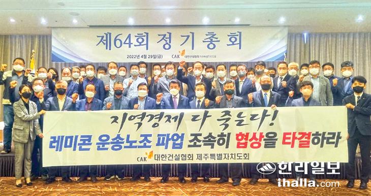 또 대한건설협회는 "제주지역 레미콘 운송노조 파업으로 레미콘 생산이 중단돼 건설산업이 큰 위기에 처해 있다"면서 조속한 협상 타결을 촉구하는 결의대회를 열었다.