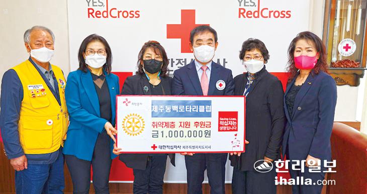 제주동백로타리클럽(회장 강경금)은 지난달 29일 대한적십자사제주특별자치도지사(회장 오홍식)를 방문해 지역사회의 소외된 이웃을 위해 써달라며 후원금 100만원을 전달했다.