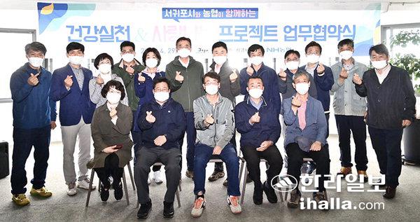 서귀포시와 NH농협 서귀포시지부(지부장 김현우), 서귀포시 농축협운영협의회(회장 백성익)는 지난달 29일 올레 6코스 내에 있는 '소라의 성'에서 '건강실천 & 사랑나눔 프로젝트 추진을 위한 업무협약'을 체결했다.