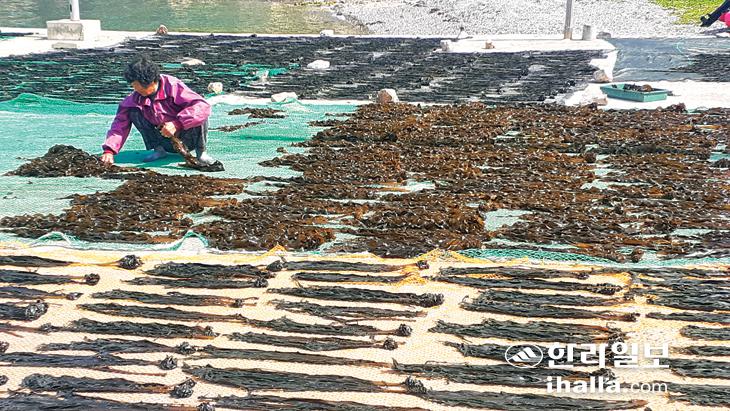 1일 제주시 추자면 묵리 포구에서 한 주민이 청정해역에서 채취한 돌미역을 봄볕에 말리고 있다. 강희만기자
