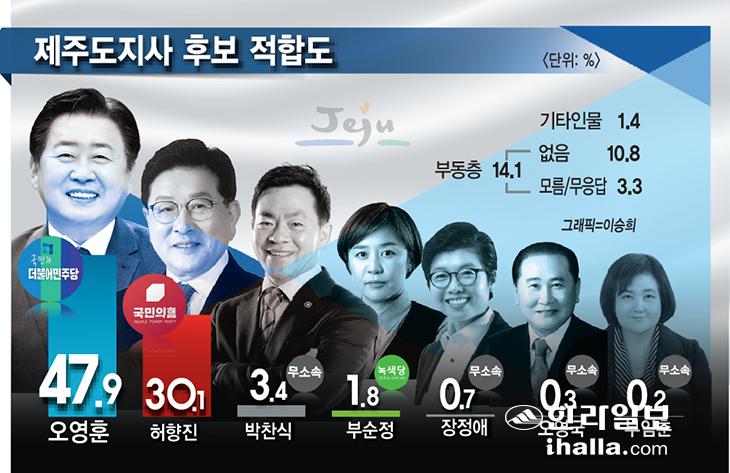 제주도지사 후보 적합도 조사에서 더불어민주당 오영훈 후보가 47.9%로 30.1%를 얻은 국민의힘 허향진 예비후보를 17.8%p 앞섰다. 이어 무소속 박찬식 후보 3.4%, 녹색당 부순정 후보 1.8%, 무소속 장정애 후보 0.7%, 무소속 오영국 후보 0.3%, 무소속 부임춘 후보 0.2%, 기타 인물 1.4%, 없다 10.8%, 모름·무응답 3.3% 순으로 나타났다.