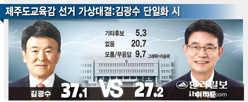김광수 예비후보와 이석문 예비후보의 가상 대결에서도 김광수 예비후보가 37.1%로 27.2%를 기록한 이석문 예비후보에 비해 10% 가까이 우세했다. 기타 후보는 5.3%였으며, 부동층은 없음 20.7%, 모름·무응답 9.7% 등 총 30.4%였다. 김광수 예비후보는 ▷60세 이상(46.2%) ▷50대(43.4%) ▷보수층(48.5%) ▷중도층(41.5%) ▷무직·은퇴·기타(45.3%) ▷자영업(43.4%) ▷국민의힘 지지층(55.3%)에서, 이석문 예비후보는 ▷40대(31.9%) ▷30대(30.8%) ▷진보층(37.5%) ▷가정주부(34.5%) ▷더불어민주당 지지층(38.3%)에서 많은 선택을 받았다.