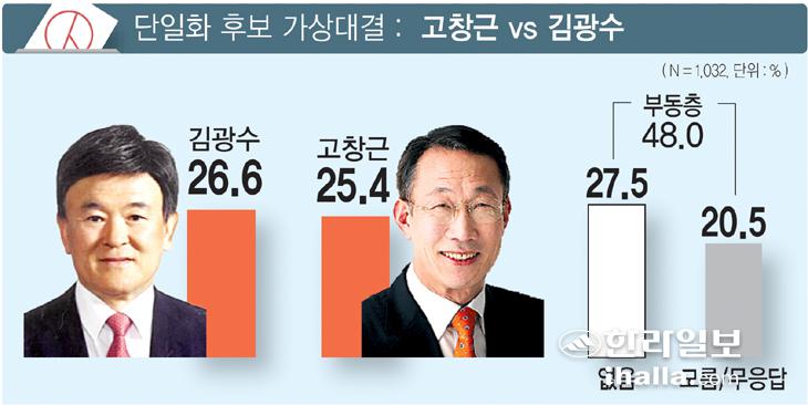 먼저 보수 단일화 후보 가상대결에서는 고창근(71) 예비후보 25.4%, 김광수(69) 예비후보 26.6%로 오차범위 내 초접전인 것으로 나타났다. 다만 없음 27.5%, 모름·무응답 20.5%로, 부동층이 48.0%에 달했다.
