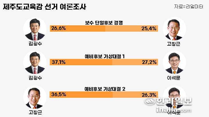 제주도교육감 선거 여론조사 결과 보수 단일화 경쟁은 오차범위 내에서 초접전을 벌이는 반면 단일화 이후 이석문 예비후보와의 가상 맞대결에서는 2명의 후보자 모두 우세를 점한 것으로 확인됐다. 보수 단일후보는 3일 결정될 것으로 보인다.