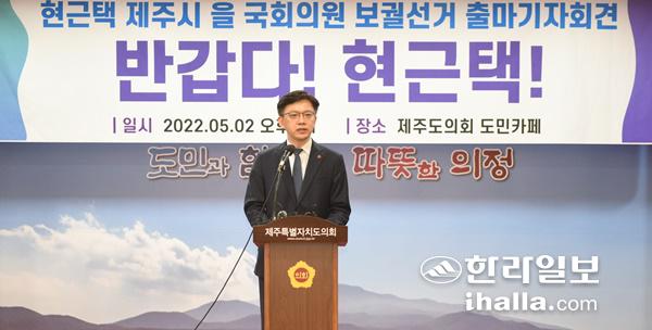 더불어민주당 현근택(50) 전 이재명 대선후보 대변인이 2일 제주도의회 도민카페에서 기자회견을 열고 제주시을 국회의원 보궐선거 출마를 공식화했다. 이상국기자