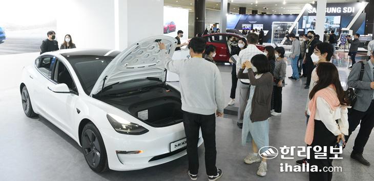 3일 서귀포시 소재 제주국제컨벤션센터에서 개막한 제9회 국제전기자동차엑스포 참가자들이 전기차를 둘러보고 있다. 이상국기자