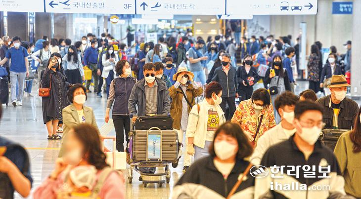 어린이날인 5일 제주국제공항 국내선 도착장이 제주를 찾은 관광객들로 인산인해를 이루고 있다. 이상국기자