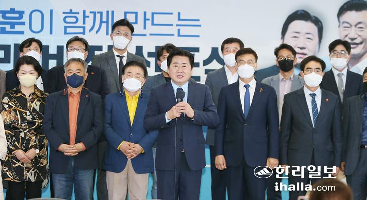6일 제주시 도령로에 위치한 오영훈 선거캠프에서 열린 '문대림·오영훈이 함께 만드는 제주의 미래 비전 선포식'에서 제주도지사에 출마한 오영훈 예비후보가 인사말을 하고 있다.