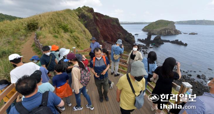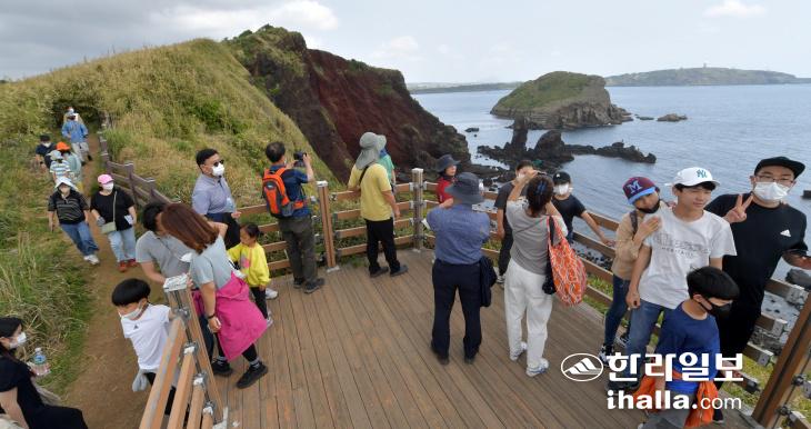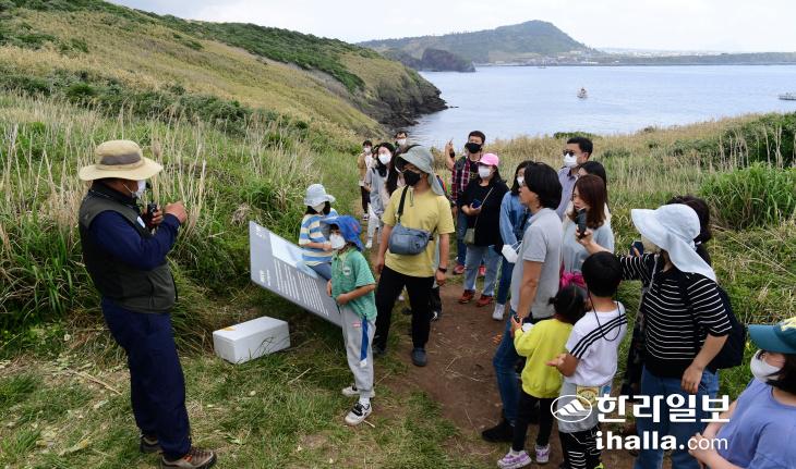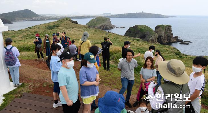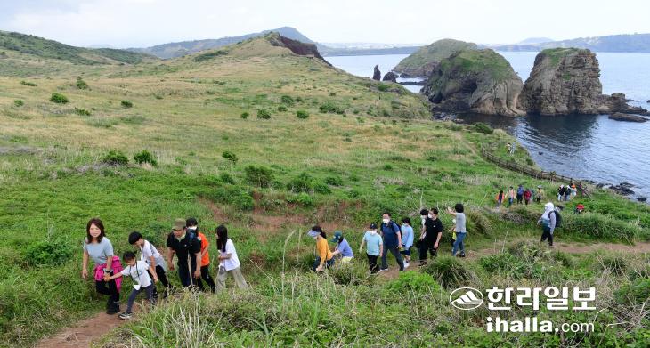 2022 제주도 지질공원 수월봉 트레일 마지막 날인 8일 차귀도를 찾은 탐방객들이 섬을 둘러보고 있다. 현재 무인도인 차귀도는 해수면 변동과 파도에 의한 풍화 침식 작용으로 화산체의 대부분이 사라지고 섬의 일부만 독특한 형태로 남아있다. 강희만기자