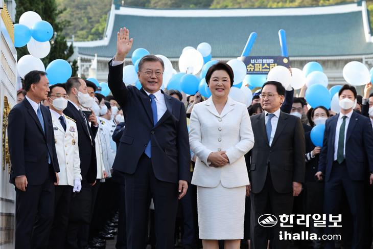 문재인 대통령과 김정숙 여사가 9일 오후 청와대 직원들의 배웅을 받으며 청와대를 나선 뒤 시민들을 향해 인사하고 있다. 연합뉴스