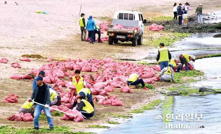 9일 제주시 이호해수욕장에서 바다환경지킴이들이 파도에 밀려온 해초와 괭생이모자반을 수거하고 있다. 강희만기자