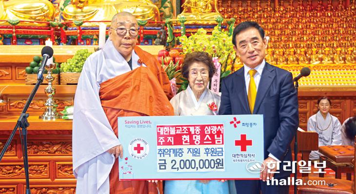 대한불교조계종 삼광사(주지 현명스님, 신도회장 김문자)는 지난 8일 삼광사 대법당에서 대한적십자사제주특별자치도지사(회장 오홍식)에 취약계층 지원을 위한 후원금 200만원을 기탁했다.