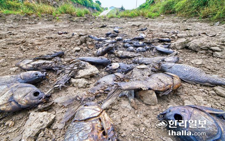 10일 서귀포시 대정읍 상모리 한 저수지에 물이 말라 바닥이 드러나자 붕어들이 죽은채 발견됐다. 강희만기자