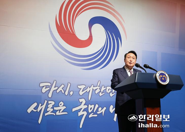 윤석열 대통령이 11일 오후 서울 중구 롯데호텔에서 열린 재외동포 초청 리셉션에서 인사말을 하고 있다.연합뉴스