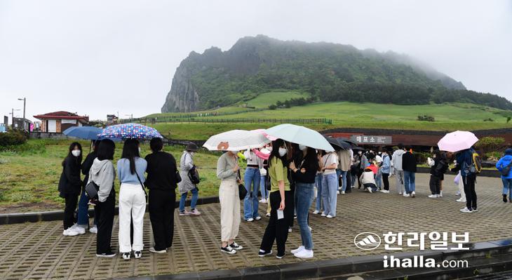 11일 서귀포시 성산일출봉을 찾은 수학여행단 학생들이 봄비 속에서 제주의 정취를 즐기고 있다. 강희만기자
