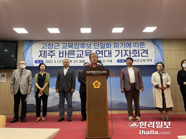 제주바른교육연대는 12일 제주도의회 도민카페에서 기자회견을 열고 김광수 예비후보에 대한 지지를 선언했다. 송은범기자