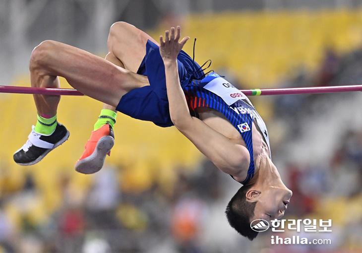 우상혁이 14일(한국시간) 카타르 도하에서 열린 2022 세계육상연맹 다이아몬드리그 개막전 남자 높이뛰기 결선에서 바를 넘고 있다. 이날 우상혁은 2m33으로 우승했다. 연합뉴스