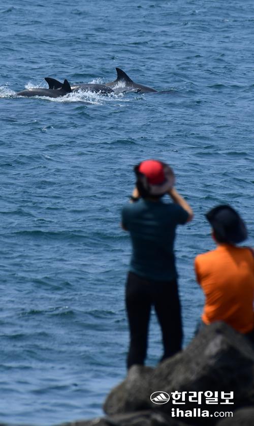 15일 서귀포시 대정읍 해안도로 앞바다에서 한무리의 남방큰돌고래들이 군무를 펼치는 모습이 관찰됐다. 강희만기자
