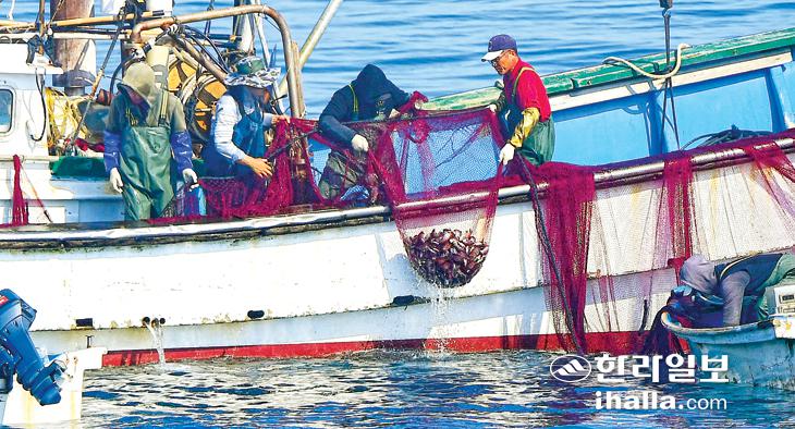 지난 14일 국토 최남단 마라도 인근 해상에서 어부들이 자리돔이 가득찬 그물을 끌어 올리고 있다. 강희만기자