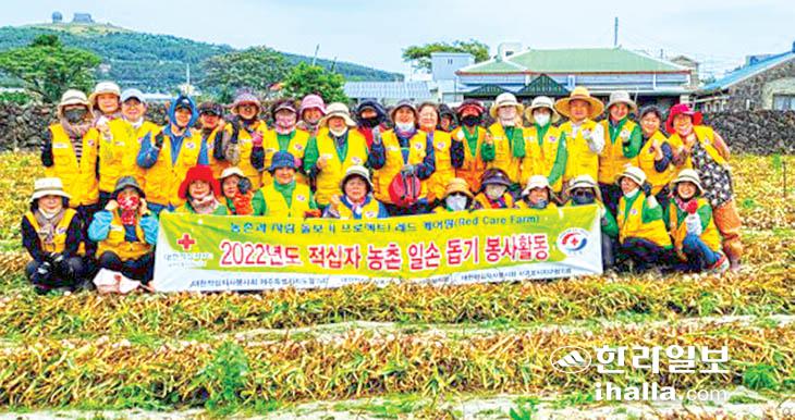 대한적십자사봉사회서귀포시지구협의회(회장 강미정)는 지난 15일 서귀포시 대정읍 일대에서 봉사원 40여명이 참여한 가운데 취약농가 마늘수확 일손돕기 봉사활동을 실시했다.