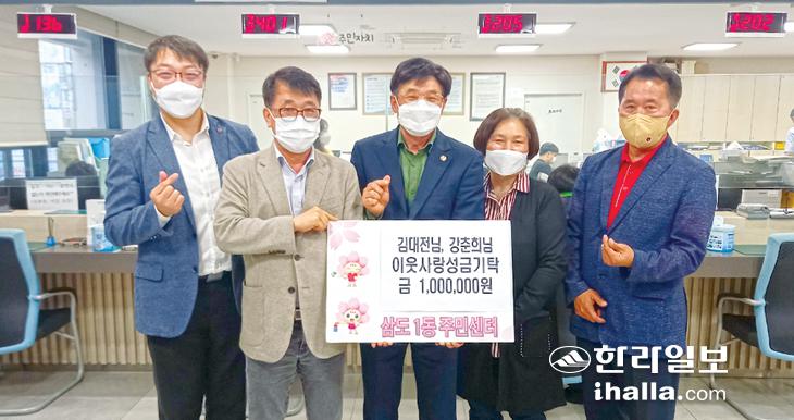 제주시 삼도1동 주민자치위원회 김대전 사무국장과 배우자 강춘희씨는 지난 13일 삼도1동 관내 도움이 필요한 이웃을 위해 써달라며 100만원을 기탁했다. 기탁한 성금은 저소득층 생계비, 의료비 등으로 쓰일 예정이다.
