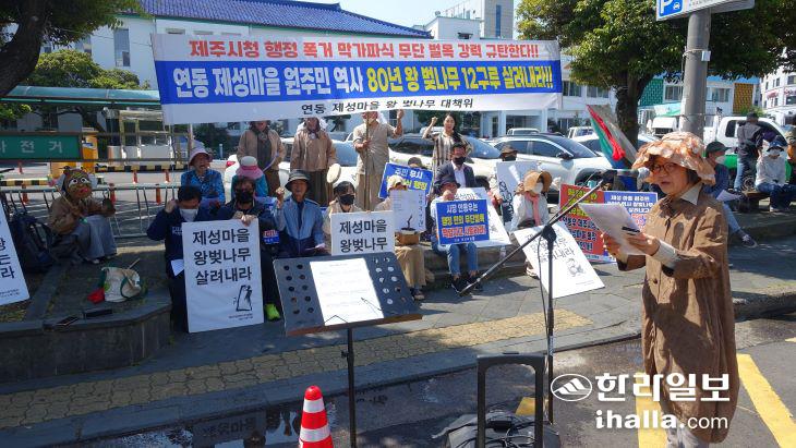 제주시 연동 제성마을 왕벚나무 비상대책위원회 관계자들이 17일 제주시청 앞에서 기자회견을 열고 있다. 김도영기자