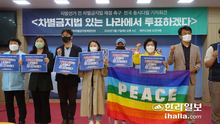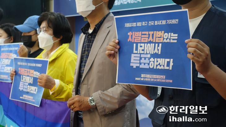 제주차별금지법제정연대가 17일 제주도의회에서 기자회견을 열고 즉각적인 법 제정을 촉구했다. 김도영기자