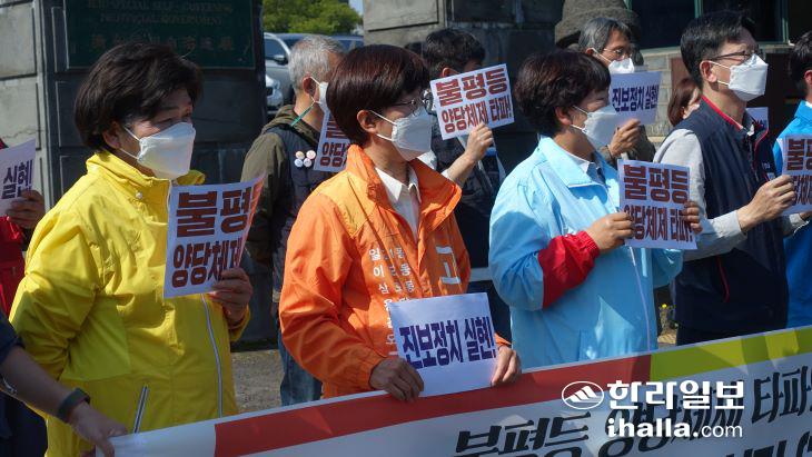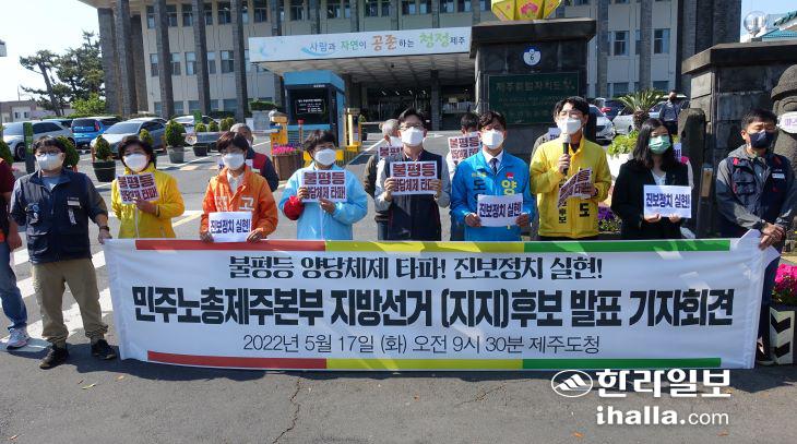 민주노총 제주본부는 17일 제주도청 앞에서 지방선거 지지 후보 발표 기자회견을 열고 "6월 1일 지방선거를 불평등 양당체제를 타파하고 진보정치를 실현하는 새로운 출발로 만들겠다"고 말했다.