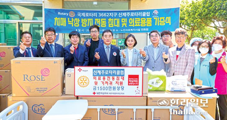 대한적십자사제주특별자치도지사(회장 오홍식)는 최근 연화원 앞마당에서 신제주로타리클럽(회장 임부훈)의 후원으로 마련된 1500만원 상당의 의료용 전동침대와 기저귀를 사회복지법인 연화원에 전달했다.