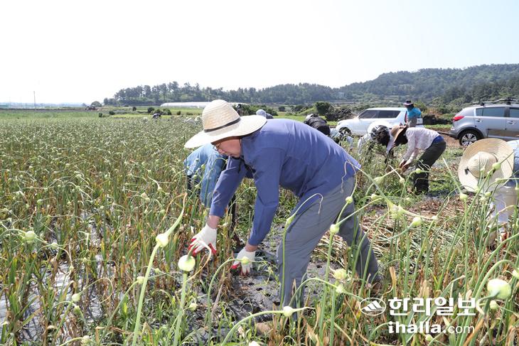 18일 제주시 한경면의 한 농가에서 안동우 제주시장 등 공직자들이 마늘 수확 작업을 하고 있다. 사진=제주시