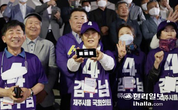 무소속 김우남 제주시을 국회의원 후보가 19일 제주시청 앞 어울림마당에서 출정식을 열고 있다.
