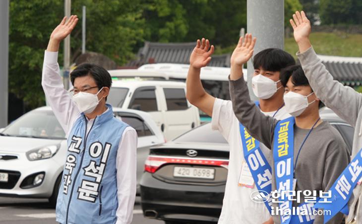 이석문 제주도교육감 후보가 19일 제주시 아라동에서 유권자들에게 인사를 건네고 있다.