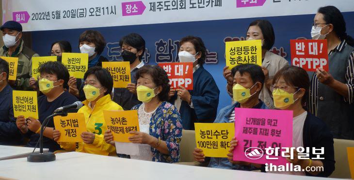 전국여성농민회총연합 제주도연합(이하 여성농민회)은 20일 제주도의회 도민카페에서 '김정임 도의원 후보 1000인 지지' 기자회견을 열고 "정의당 비례대표 1번인 여성농민 김정임 제주도의원 후보를 지지한다"고 밝혔다.