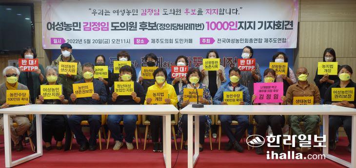 전국여성농민회총연합 제주도연합(이하 여성농민회)은 20일 제주도의회 도민카페에서 '김정임 도의원 후보 1000인 지지' 기자회견을 열고 "정의당 비례대표 1번인 여성농민 김정임 제주도의원 후보를 지지한다"고 밝혔다.