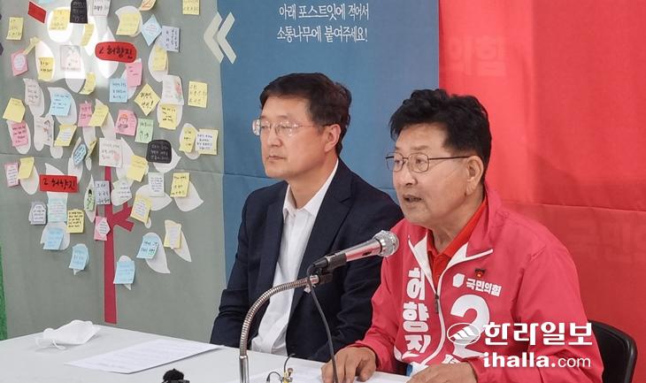 국민의힘 허향진 제주특별자치도지사 후보는 20일 '권성동 원내대표의 4·3보상금 대법원 판결 금액 상향 약속에 따른 기자회견'을 열었다.