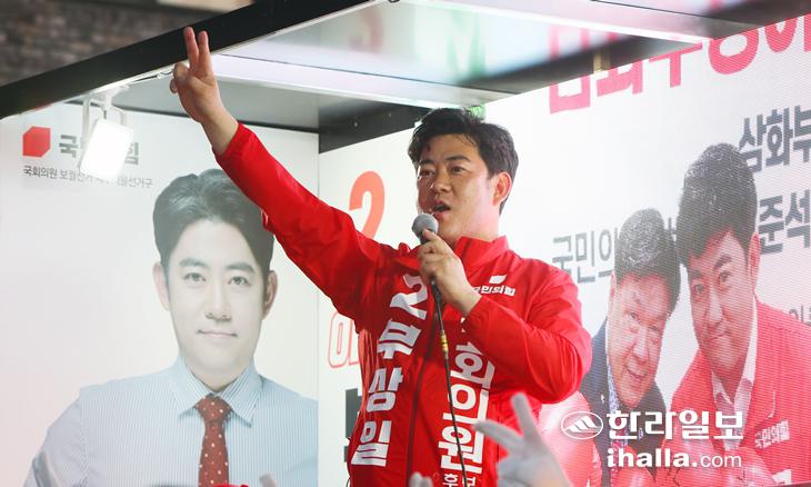 제주시을 국회의원 보궐선거에 출마한 국민의힘 부상일 후보가 20일 오후 제주시 삼화지구 내 공터에서 출정식을 열어 지지를 호소하고 있다.