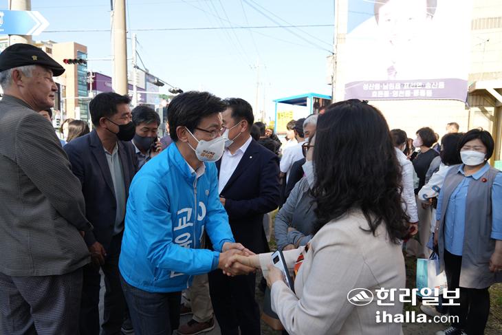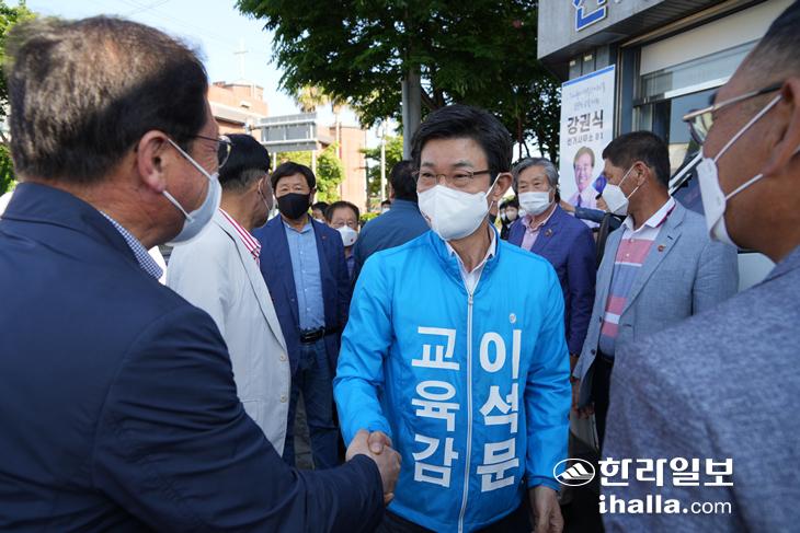 이석문(63) 제주도교육감 후보는 21일 서귀포시 동홍사거리에서 열린 출정식 겸 서귀포 유세를 앞두고 지지자들에게 인사를 건네고 있다.