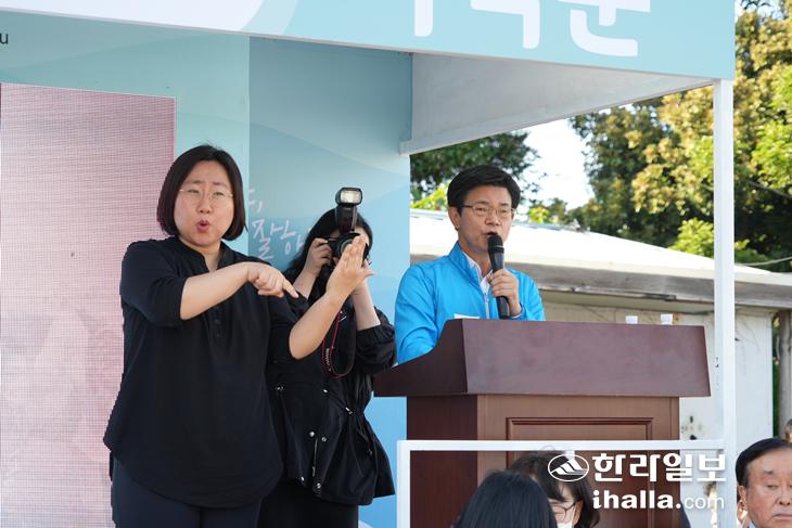 이석문(63) 제주도교육감 후보는 21일 서귀포시 동홍사거리에서 열린 출정식 겸 서귀포 유세에서 지지를 호소하고 있다.