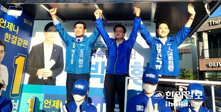 박호형 후보는 21일 제주시 일도2동 인제사거리에서 출정식을 열고 필승을 다짐했다.사진=선거사무소 제공