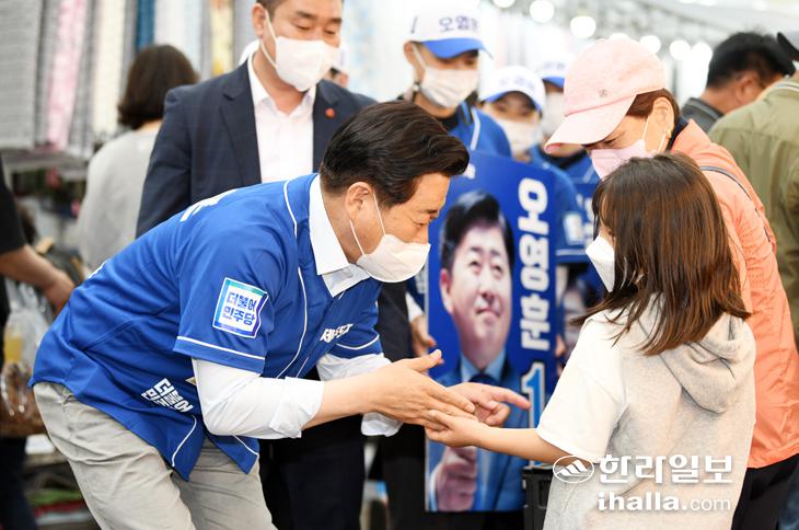 더불어민주당 오영훈 제주도지사 후보가 22일 장이 열린 제주시 민속오일시장을 찾아 지지를 호소하고 있다. 강희만기자
