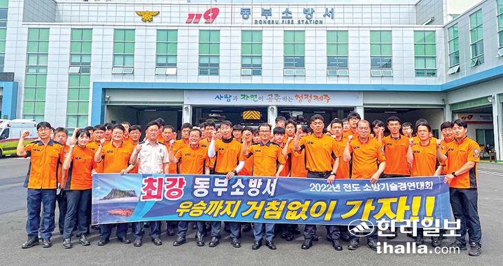 제주동부소방서(서장 조승혁)는 지난 20일 '2022년 전도소방기술경연대회' 선수단 출정식을 개최했다. 소방서 선수단은 화재분야(속도 방수), 구조분야(응용 구조), 최강소방관 등 세 종목에 참가할 예정이다.