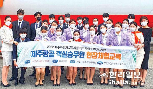 제주관광대학교(총장 김성규)는 항공서비스과 학생들은 최근 김포공항을 출발해 2시간 15분간의 선회비행 후 다시 김포로 착륙하는 비행기 안에서 객실 안전과 서비스를 제공하는 체험을 진행했다.