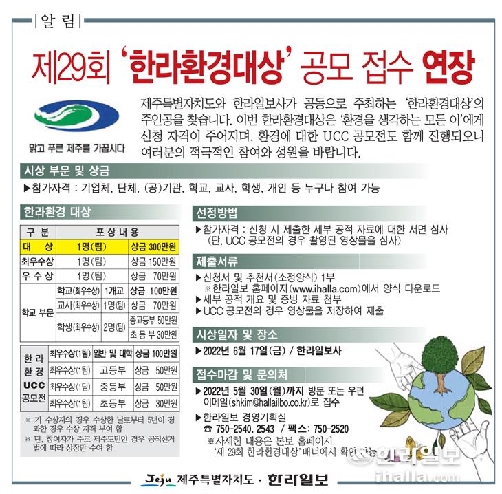 [알림] 제29회 한라환경대상 공모 접수 연장( ~5월30일까지)