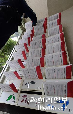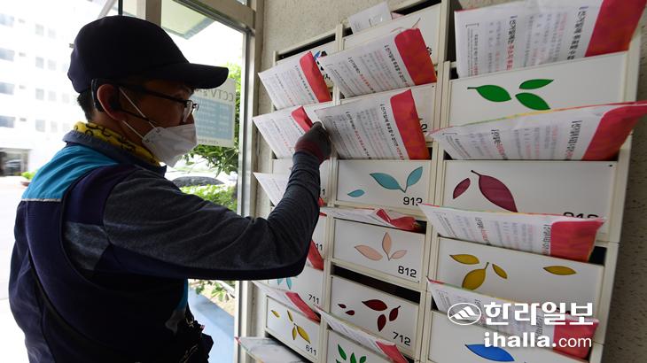 23일 6.1 전국동시지방선거를 앞두고 제주시 노형동 한 아파트에서 집배원이 선거 공보물을 배달하고 이다. 강희만기자