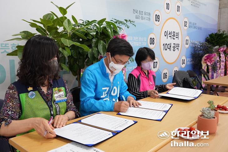 제주지역학교비정규직연대회의는 23일 이석문(63) 제주교육감 후보와 정책 협약식을 진행했다. 이석문 후보 캠프