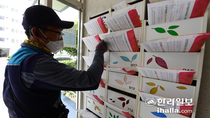 23일 제주시 노형동 한 아파트 우편함에 집배원이 선거 공보물을 넣고 있다. 강희만기자